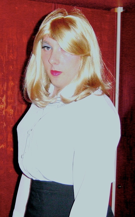 So the first look she went for was a ‘posh tottie at the races’ look. A white jumper combined with a very pretty white belt, the gold flared skirt, a gorgeous little white high-collar jacket and a lovely seventies style wig, with some flips. Throw in some white high heels and again my breath disappeared when I stared at the woman in the mirror. For a couple of years I was breathless all the time because I needed a corset done very, very tight to get near to an hourglass figure, but with this one the weight loss was starting to take effect so I had a 50’s style girdle along with a stomach clincher (yeah, modern on the outside, retro underneath).