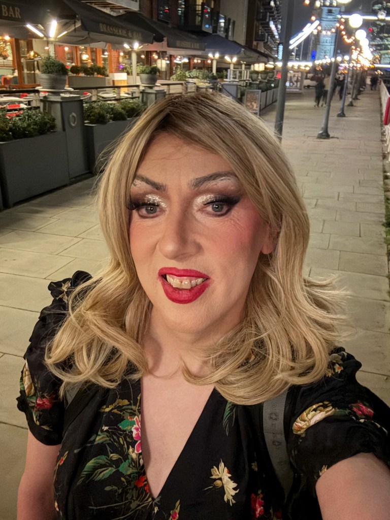 I’ve been out and about before, and once, at the last session, by myself along the river for some exciting selfies. But this was different. I had my backpack on which kinda spoilt the illusion slightly, but I tottered in a feminine way, pulling my bag on wheel, a couple of streets over to the carpark, where I daintily put my femme kit in the boot of the TT, and, shouldering the backpack but keeping my figure as femininely shaped as I could, climbed the two set of stairs to come out of the carpark.